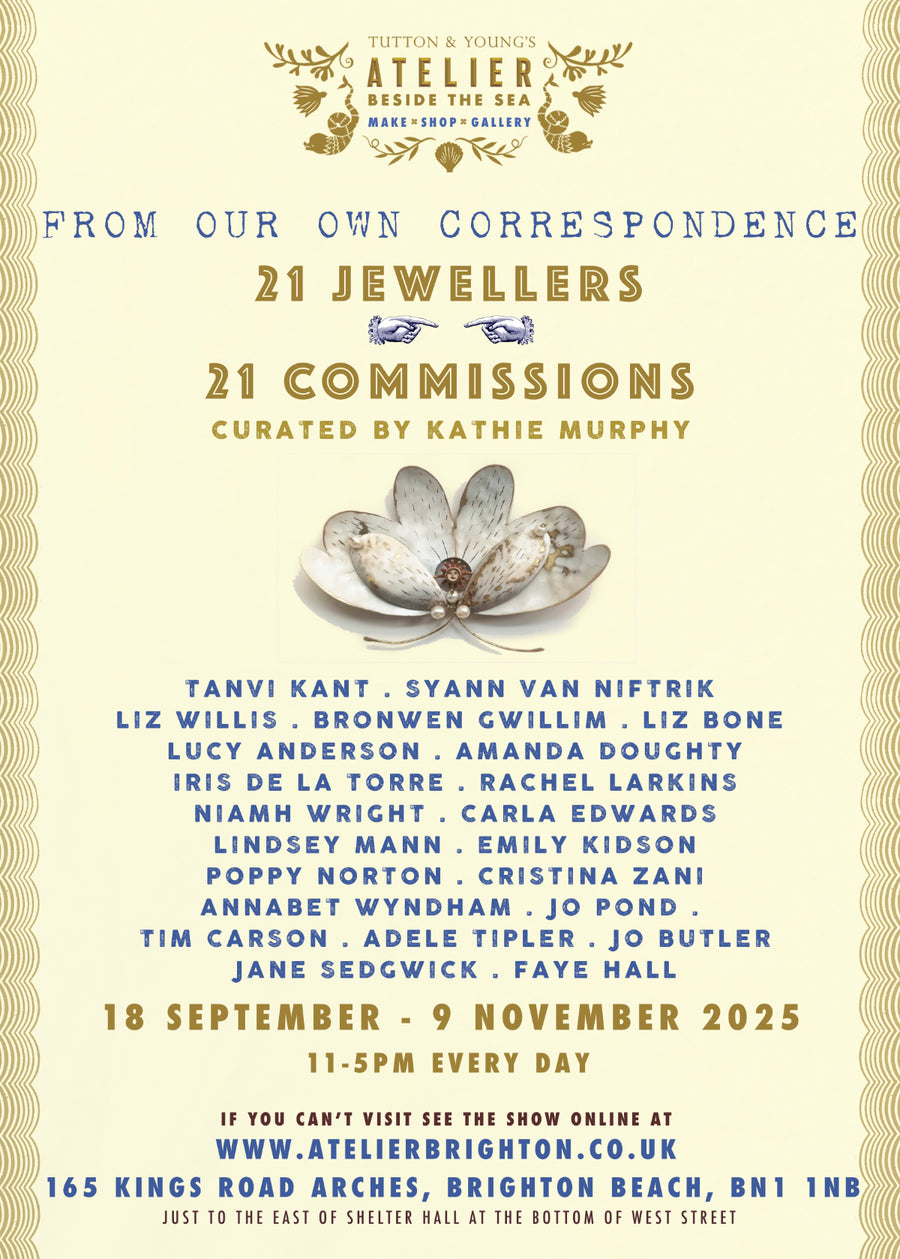 21 jewellers were invited to respond to a brief by curator-jeweller Kathie Murphy. She paired off the participants (plus herself) and asked them to commission each other to make a one-off piece prompted by a non-precious object or text. She likens the project to a daisy chain or chain letter. This exhibition showcases the process and the results. Join the fun at atelierbrighton.co.uk