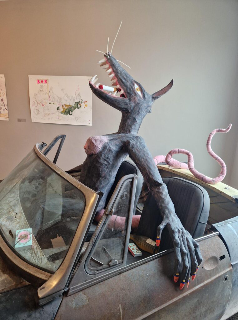 Isabel Rock’s Things Fall Apart, The Centre Cannnot Hold, one of three brilliant shows running concurrently at Hastings Contemporary, can perhaps best be described as an exuberantly psychedelic doomsday cult. There’s lots of fun to be had with Rock’s giant rat in an open-top sports car and her replica prison cell with a giant slug for a cell mate. Not to mention her large yet minutely detailed drawings – you’ll want to sit down and immerse yourself in her mutant world for hours.
