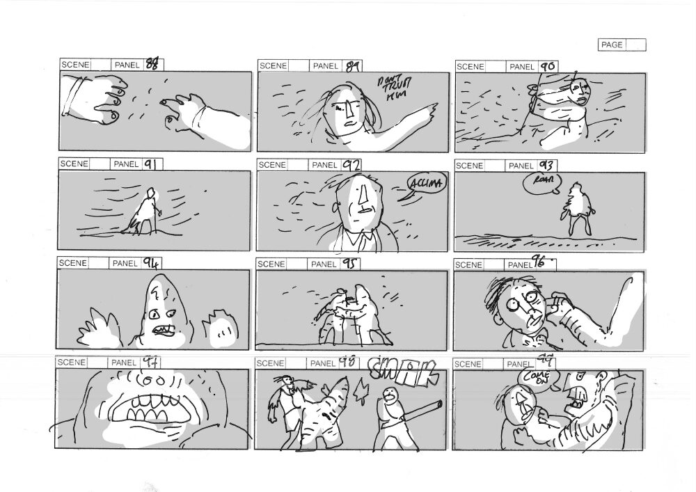 The script is always the first stage of any film, but his storyboarding – which might take up to a month of work – comes next. The script is then adapted to incorporate lessons His working process isn’t uniform. He uses standard printing paper, often with a six-square grid printed on, each representing a frame. Sometimes he uses a Rotring pen, other times a pencil. He uses Promarkers to effect shade, “not because it needs it, but it makes them look less scrappy.” On occasion he adds colour and half-tone in PhotoShop. Ideally he works at his desk, but “it can be done anywhere. I do it on the plane a lot.” For High-Rise, he produced 600 pages of storyboarding, for Meg 2, a much higher-budget production, he created over 3,000, many of which were worked up by film-industry illustrator Jake Lunt, the concept designer for numerous Star Wars movies.