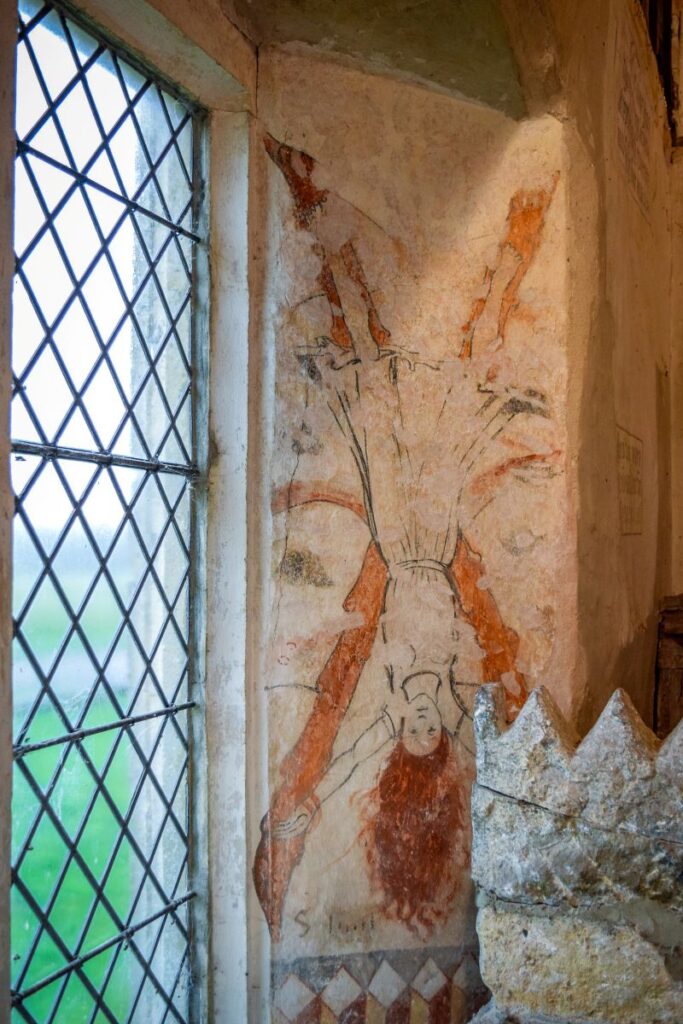 While the painting of St Wilgeforte may not be as prominent as other Sussex landmarks (it’s obscured even within the church itself, half-hidden behind a large stone memorial), it rewards those who seek it out. In its quiet, weathered beauty, it speaks to the enduring power of stories – stories of faith, defiance and the human spirit. In a world where so much of history’s nuance is lost to time, this wall painting stands as a testament to resilience. It invites us to look beyond the grand narratives and into the hidden corners where forgotten stories can still inspire.