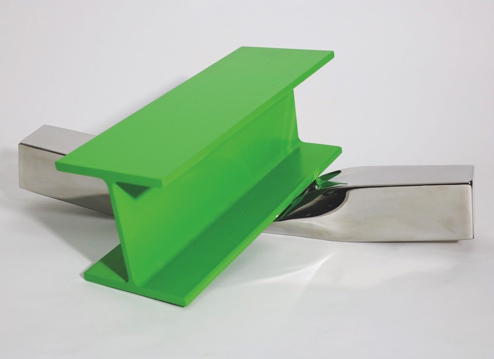 Julian uses the RAL colour-matching system that defines industrial colours for paint, coatings and plastics across the world. Just as he uses industrial colour charts, he cleaves towards industrial materials, the I-beam (a Victorian invention used for joists in building) being a consistent element in his sculptures. “I love its violent, industrial purpose.” At the same time, he’s fascinated by the control of nature. “When I was doing a show at Burghley House in Lincolnshire in 2011, I responded to Capability Brown and the idea of controlling and ordering nature. It’s insane – employing hundreds of people to dig out a lake, then to try and make it look natural. I’m probably the opposite of rewilding. I’m fascinated by yew cloud hedges and I like a bit of topiary.”